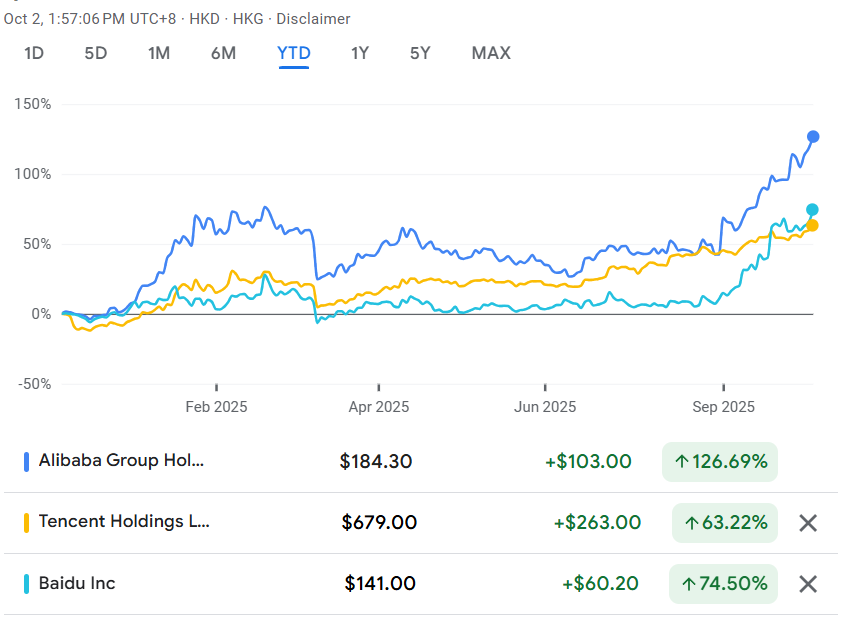 Alibaba? Plus 126%. Tencent? Un modest 63%. Baidu se mulțumește cu 74%.