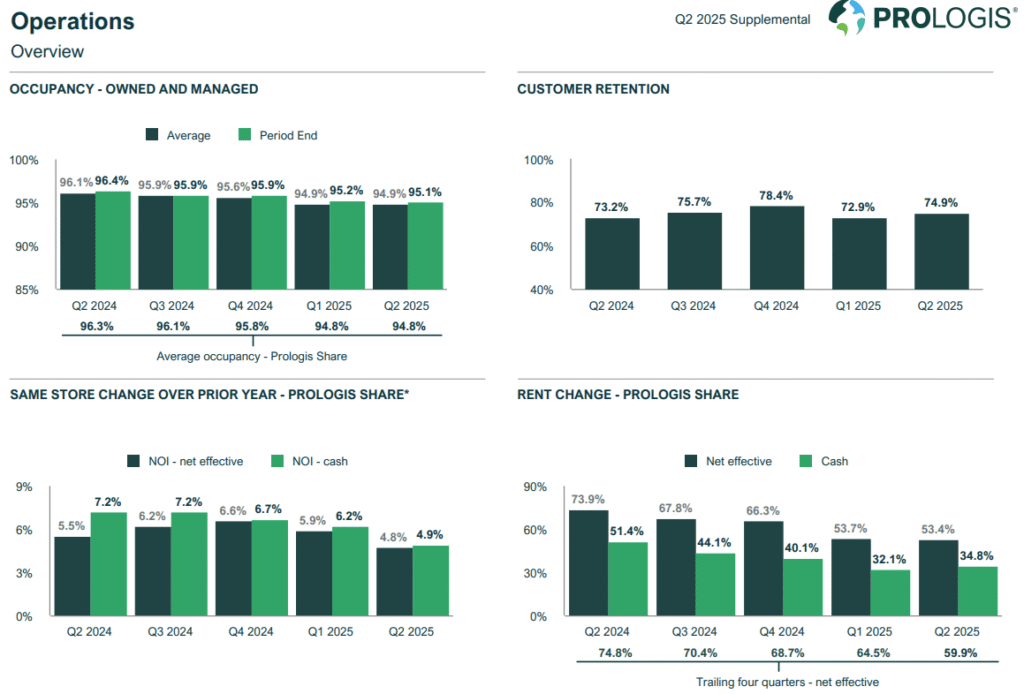 Aici devine interesant. Chiria pentru contractele reînnoite a crescut cu 53% net efectiv și 35% pe bază cash în Q2. Diferența dintre chiria actuală din portofoliu și chiriile de pe piață (mark-to-market) e încă de 22%. Asta înseamnă că, pe măsură ce contractele vechi expiră și se reînnoiesc, Prologis va încasa cu 22% mai mult pentru același spațiu.