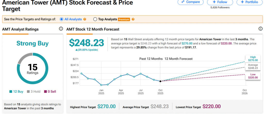 Prețul curent: 191 USD. Ținta medie a analiștilor: 248 USD. Ținta maximă: 270 USD. Gap-ul ăsta de 30% nu e garantat, dar arată că piața subevaluează potențialul. Dacă Fed-ul se hotărăște să continue să taie dobânzile (și va trebui la un moment dat), AMT va zbura.