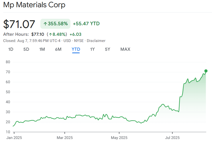 Cu o creștere de 355% de la începutul anului, acțiunile MP Materials au demonstrat că piața apreciază strategia americană de repatriare industrială.