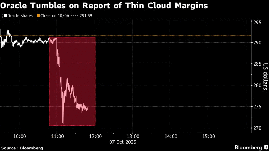 Acțiunile Oracle au făcut marți un plonjon de 6%, după ce The Information a turnat puțin oțet în cafeaua investitorilor, avertizând că marja companiei pe segmentul AI arată… să zicem, modestă.