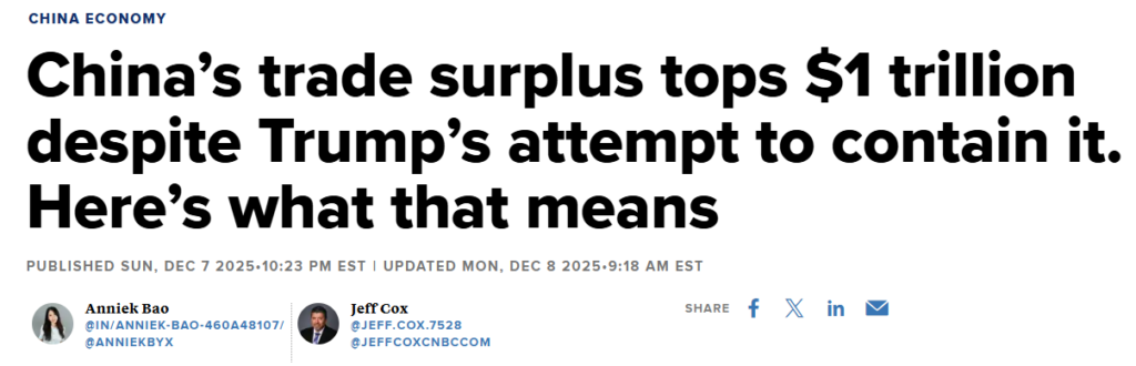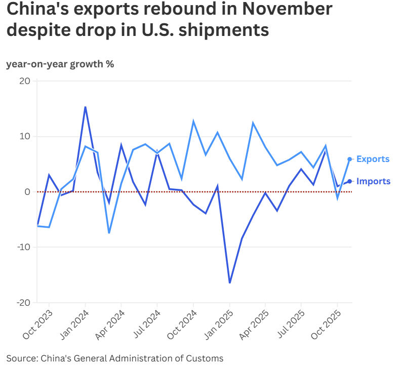Exporturile totale din noiembrie, exprimate în dolari, au crescut cu 5,9%, depășind liniștit previziunile economiștilor de 3,8%. E o revenire bruscă după declinul din octombrie și arată că pierderea pieței americane a fost rapid compensată prin redirecționare agresivă către alte destinații. Exporturile către UE au sărit cu aproape 15%, iar livrările către țările ASEAN au crescut cu peste 8%. China nu și-a pierdut clientela — și-a schimbat doar orografia.