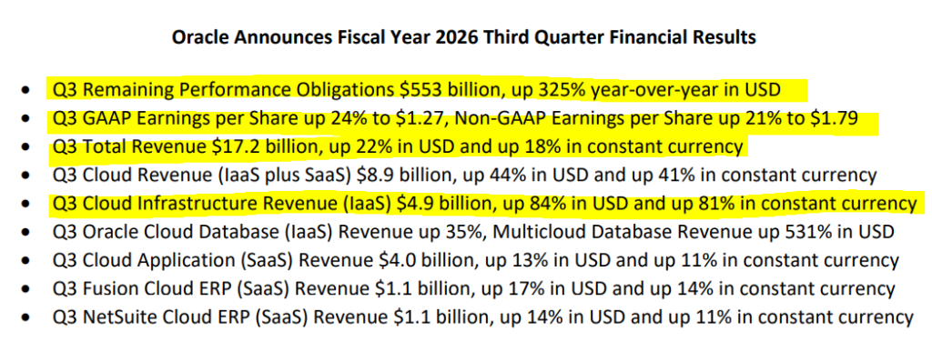 Și totuși, rezultatele au fost bune. EPS non-GAAP de 1,79 dolari pe acțiune, cu 0,10 dolari peste estimări. Venituri de 17,19 miliarde de dolari în trimestrul al treilea, în creștere cu 21,7% față de anul precedent și cu 280 de milioane peste ce așteptau analiștii. Veniturile din cloud, IaaS plus SaaS, au ajuns la 8,9 miliarde de dolari, în creștere cu 44% în dolari și 41% în monedă constantă. Dar cifra care a făcut cu adevărat diferența e alta: infrastructura cloud pură, segmentul IaaS, a crescut cu 84% față de anul precedent, ajungând la 4,9 miliarde de dolari. Contractele masive legate de AI au condus această creștere, compensând o scădere minoră de 1% a veniturilor din software tradițional la rată de schimb constantă.