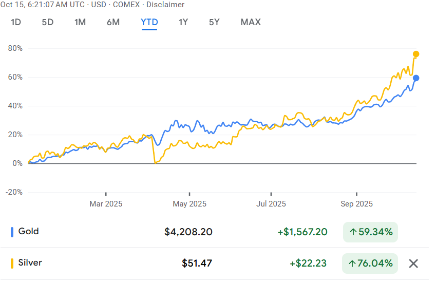 Aurul a avut un an excelent – conflictul din Ucraina și politica… să-i spunem „imprevizibilă” a administrației Trump l-au transformat în refugiul preferat al investitorilor și băncilor centrale. Dar iată că argintul îi fură din fața scenei cu o creștere de peste 70% de la începutul anului, lăsând aurul în urmă cu modestele lui 59% (da, „modeste” în contextul ăsta) până la jumătatea lunii octombrie.