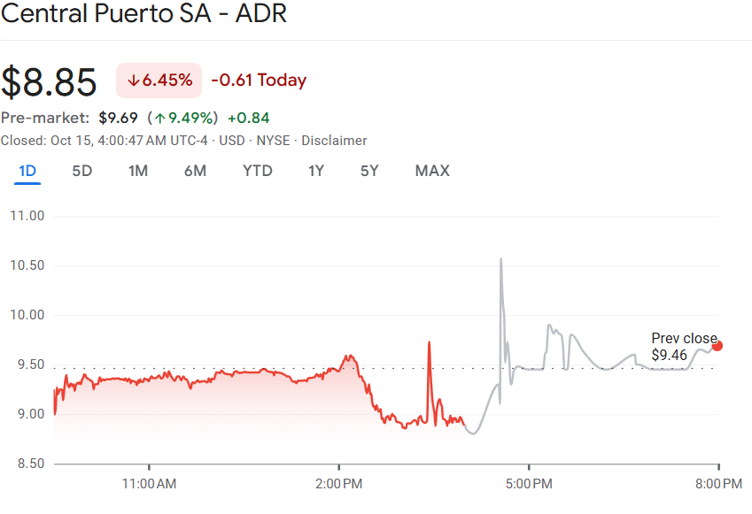 Acțiunile Central Puerto SA (NYSE:CEPU) au crescut cu 9% miercuri în pre-market, după ce Bloomberg a anunțat că producătorul argentinian de energie electrică a semnat un memorandum de înțelegere privind furnizarea potențială de energie regenerabilă pentru un proiect propus de centru de date în valoare de 25 miliarde de dolari în Argentina.