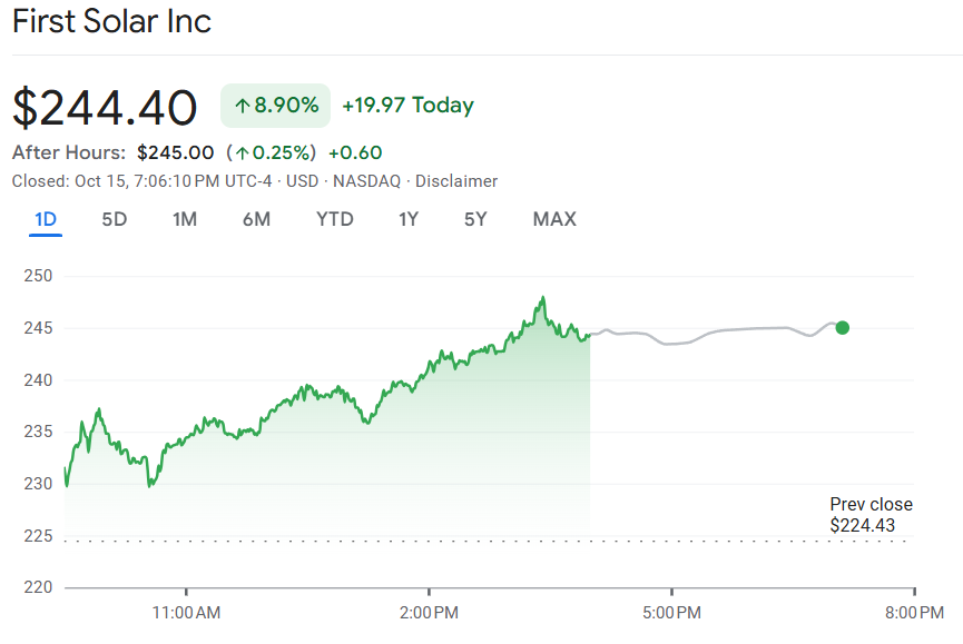 First Solar a fost subiectul mai multor evenimente pozitive într-o singură zi, ceea ce rar se întâmplă fără un motiv solid. Acțiunile au crescut ieri cu 9%, după ce: