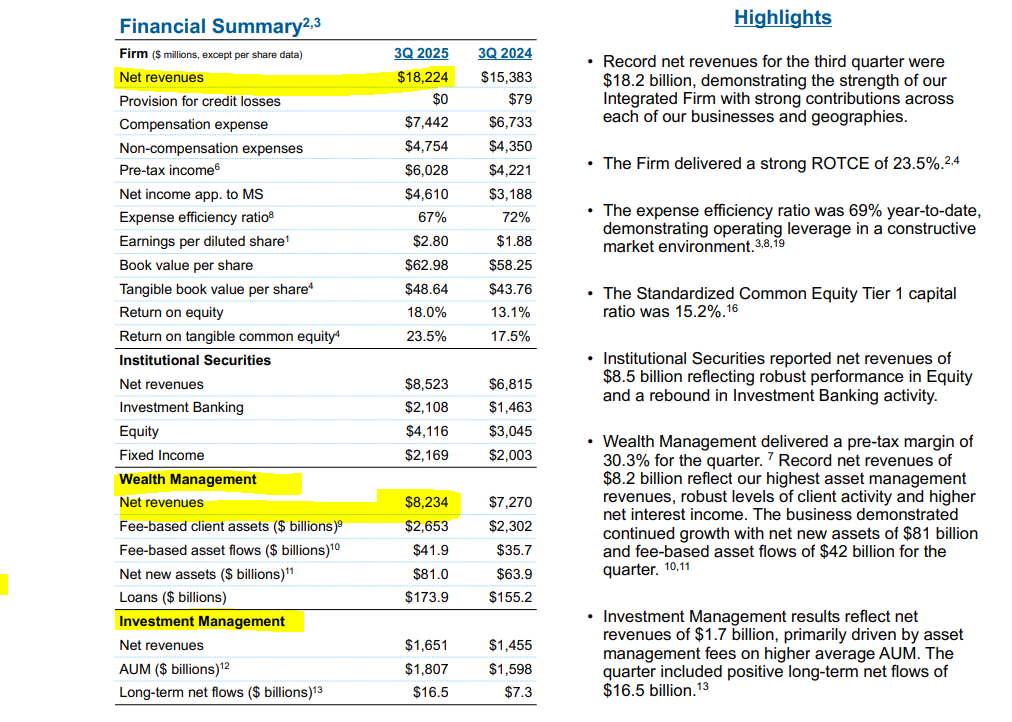Morgan Stanley a tras un venit total de 18,22 miliarde $ — un record absolut pentru al treilea trimestru — cu mult peste estimările de 16,64 miliarde. Profitul? 2,80$/acțiune, când analiștii se așteptau timid la 2,11$. Nu e o diferență mică, e o palmă peste față pentru cei care pariau pe continuarea stagnării.