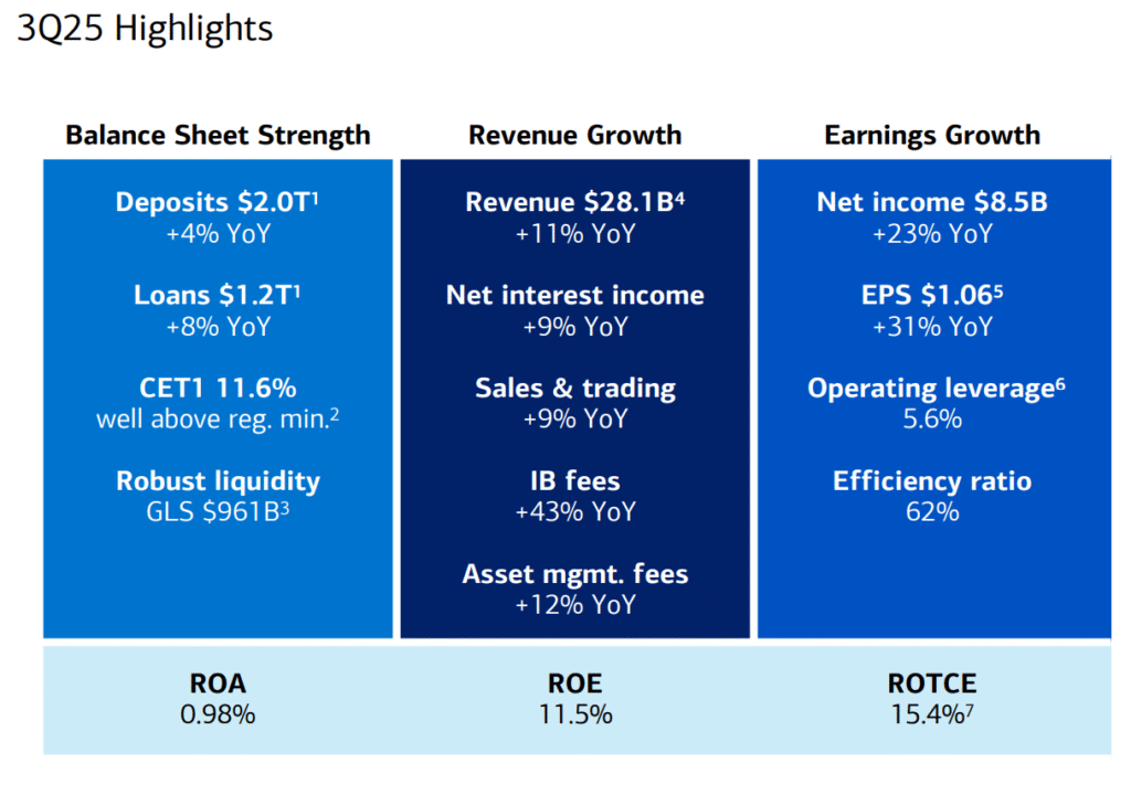 Venitul total, după deducerea cheltuielilor cu dobânzile, a fost de 28,1 miliarde $, iar profitul diluat pe acțiune a crescut la 1,06$. Ambii indicatori au fost peste previziuni. Ca bonus, banca a returnat acționarilor 7,4 miliarde $ printr-o combinație de dividende și răscumpărarea de acțiuni. Adică nu doar că merge bine, dar împarte și din câștig.