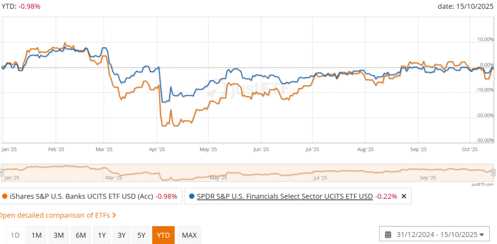 Unde se propagă efectul? ETF-urile care urmăresc sectorul financiar (SPDR S&P U.S. Financials Select Sector ETF, iShares S&P U.S. Banks UCITS ETF USD) vor beneficia direct de performanța companiilor mari de pe Wall Street. Creșterea acestor giganți trage în sus întregul indice — e simplu: când merg bine cei mari, toți ceilalți profită.