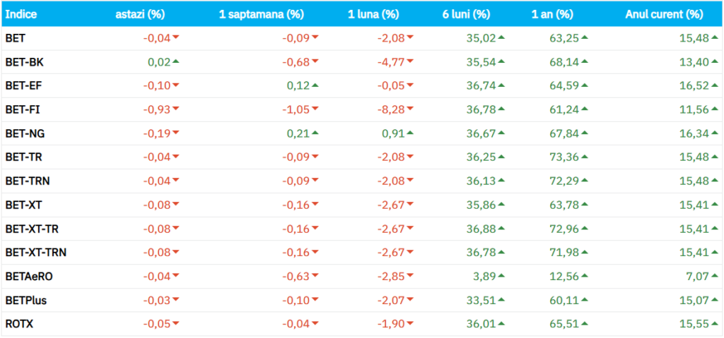 Bursa de Valori București a închis în scădere pe aproape toți indicii. BET s-a depreciat cu 0,04% până la 28.221,57 puncte, BET-Plus a pierdut 0,03%, iar BET-NG a retrogradat cu 0,19%. Singurul care a terminat pe plus a fost BET-BK, cu un câștig simbolic de 0,02%.