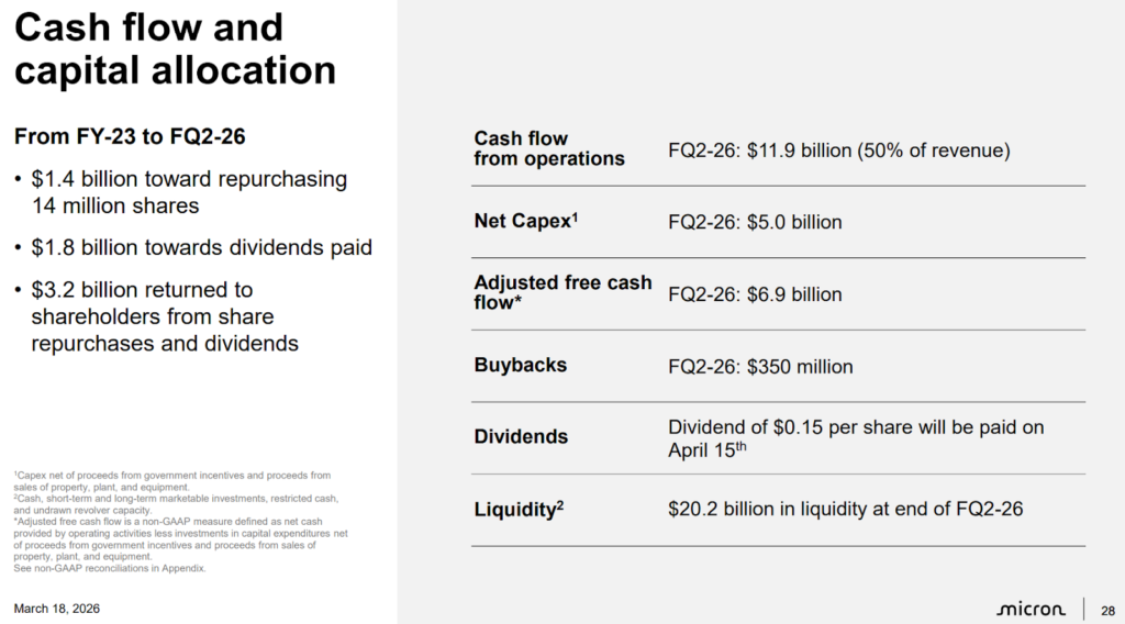 Iar pentru trimestrul următor, prognoza este și mai ambițioasă: venituri estimate la 33,5 miliarde de dolari, plus sau minus 750 de milioane, și un EPS de 19,15 dolari, plus sau minus 0,40 dolari. Barclays a reacționat imediat, majorând prețul țintă de la 450 de dolari la 675 de dolari și menținând ratingul „Overweight”, invocând condiții tensionate de cerere și ofertă atât pentru DRAM cât și pentru NAND pe tot parcursul anului 2026.