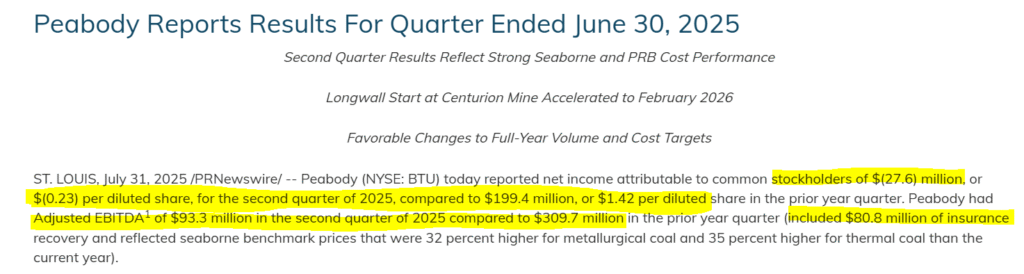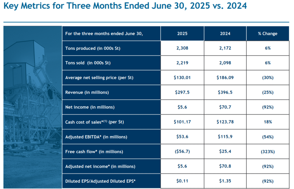 Realitatea Q2 2025 e mai puțin romantică: pierdere netă de 27,6 milioane dolari (0,23$ pe acțiune), față de profitul de 199,4 milioane din Q2 2024. Explicația? Prețurile la cărbune s-au prăbușit cu 32% la metalurgic și 35% la termic. Plus că în 2024 avuseseră o recuperare de asigurare de 80,8 milioane – genul de „bonus” care nu se repetă.