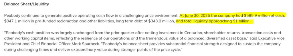 Rezultatele Q2 2025 au fost o surpriză plăcută într-o piață dificilă. Compania a raportat un EPS de 0,11 USD, depășind semnificativ estimările analiștilor care anticipau o pierdere. Veniturile de 297,5 milioane USD au depășit și ele ușor așteptările, deși ambele cifre sunt în scădere față de Q2 2024 din cauza prețurilor globale mai mici la cărbune.