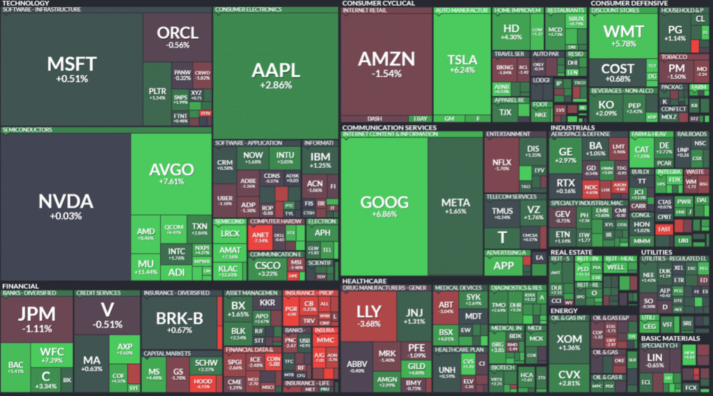 Dow a urcat 1,6%, S&P 500 s-a îmbogățit cu 1,7%, iar Nasdaq – vedetă la performanță – a sărit cu 2,1%. Russell 2000, eternul optimist al companiilor mici, a adăugat un entuziast 2,4%.