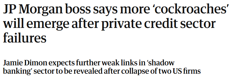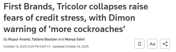 Jamie Dimon, șeful JPMorgan și profetul apocalipsei bancare de serviciu, și-a făcut din nou apariția cu avertismente despre „gândaci” pe piața de credit. Când Dimon vorbește despre gândaci, de obicei înseamnă că sunt șobolani. Iar când menționează șobolani, probabil că e vorba de dinozauri. Tricolour Holdings și First Brands Group au căzut deja – doar două nume pe care piața le-a trecut elegant cu buretele, de parcă ar fi fost niște accidente izolate, fără legătură cu realitatea.
