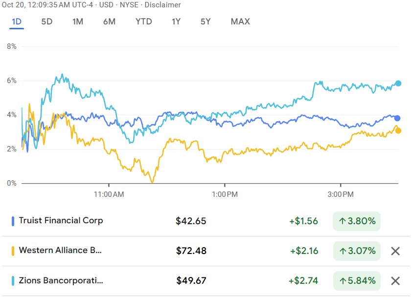 Vineri, aceleași bănci regionale au revenit spectaculos. Truist Financial, Regions Financial și Fifth Third au raportat rezultate mai bune decât așteptările. Zions – vedeta negativă de joi – a crescut cu 5,8% până la 49,67 dolari. Truist a câștigat 3,67%, Western Alliance a adăugat 3,1%, Fifth Third a urcat cu 1,31%.
