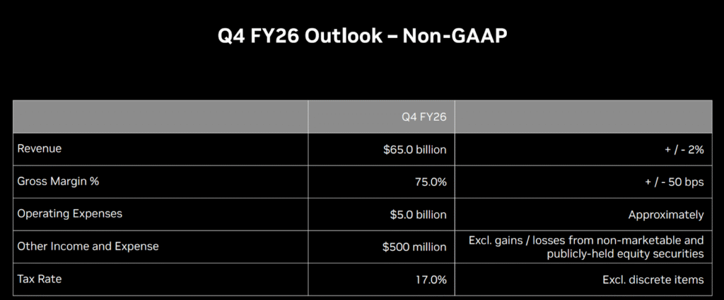 Pentru trimestrul următor, compania se așteaptă la venituri de 65 miliarde USD (±2%) și marje între 74-75% – bine peste estimarea consensului de 62 miliarde. Directorul financiar Colette Kress a declarat că cipurile Blackwell, modelul de referință al companiei, sunt epuizate. Mai mult, Kress a estimat venituri de jumătate de trilion de dolari din vânzările de cipuri Blackwell și Rubin între începutul acestui an și finalul anului 2026.