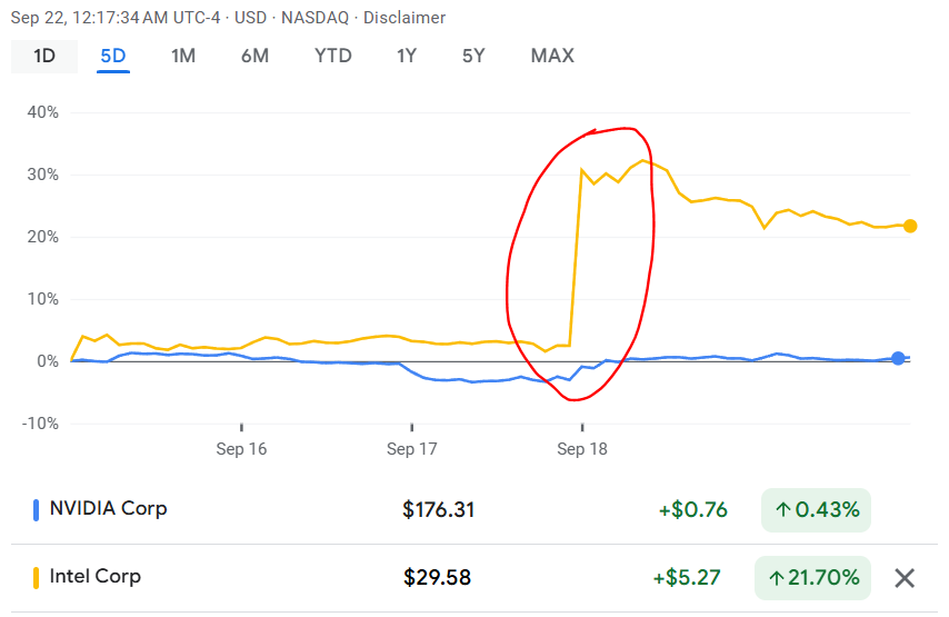 Sectorul tech a dominat din nou spectacolul. Intel a explodat cu peste 22% joi, după ce NVIDIA a hotărât să investească 5 miliarde de dolari într-o colaborare pentru dezvoltarea de chipuri. NVIDIA s-a mulțumit cu o creștere de peste 3%, comportându-se neobișnuit de modest pentru standardele companiei.