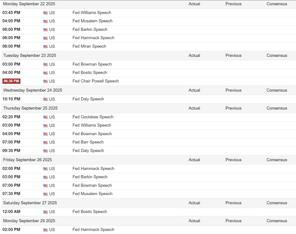 Printre vorbitorii săptămânii se numără chiar Jerome Powell, noul guvernator Stephen Miran și vicepreședintele pentru supraveghere Michelle Bowman. Participanții la piață vor asculta cu atenția la fiecare cuvânt, căutând indicii despre următoarele mișcări ale băncii centrale.