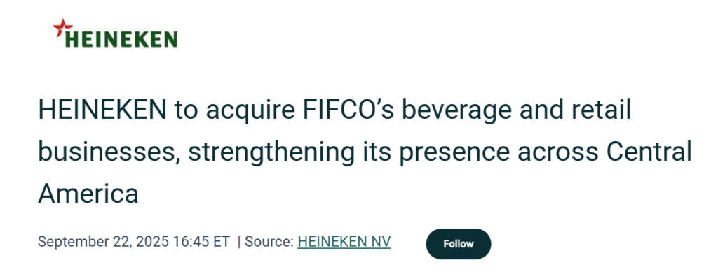 Heineken tocmai a semnat un cec de 3,2 miliarde de dolari pentru a-și cumpăra o bucată serioasă din America Centrală, achiziționând afacerea cu băuturi și comerț cu amănuntul a companiei Florida Ice and Farm Company (FIFCO).