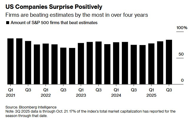 Conform Bloomberg, 85% dintre companiile din S&P 500 care au raportat pentru Q3 au depășit așteptările de profit – cea mai bună rată de succes din ultimii patru ani, de pe vremea lui 2021. Nu e o performanță obișnuită.