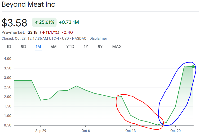 Contextul? Săptămâna trecută scriam despre Beyond Meat când acțiunile scăzuseră cu aproape 90% – o corecție care, pentru unii investitori speculativi, probabil a arătat ca o „oportunitate”. Acum vedem efectul: un clasic pump speculativ în stilul acțiunilor-meme, alimentat de social media și FOMO.