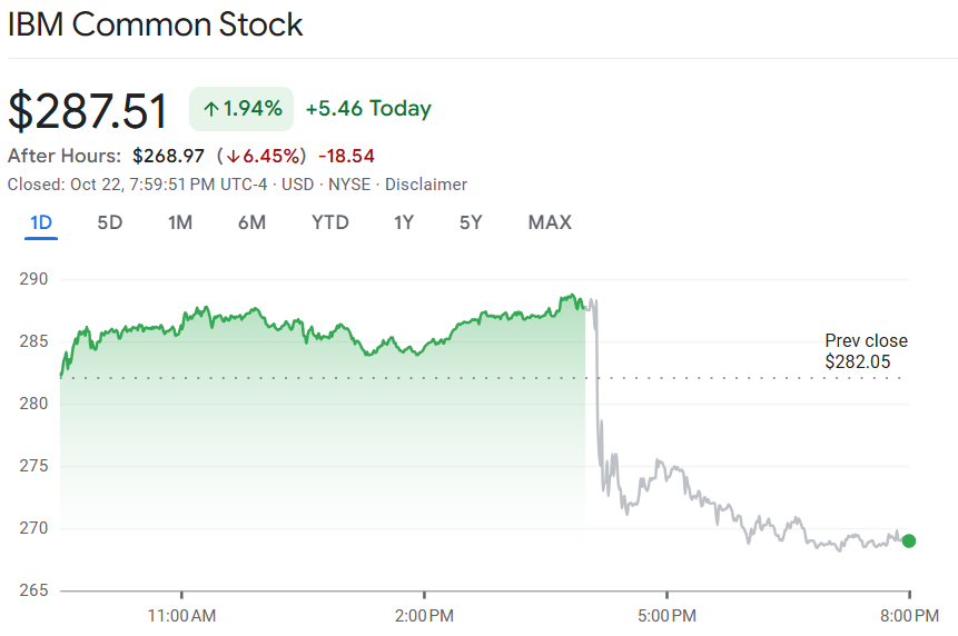 IBM a scăzut cu 6% miercuri în after hours, în ciuda rezultatelor trimestriale care au depășit așteptările. Motivul? Creșterea a fost considerată prea lentă. Compania prognozează o creștere a veniturilor în monedă constantă de peste 5% pentru întregul an – ceea ce presupune o încetinire față de creșterea de 7% din trimestrul curent.