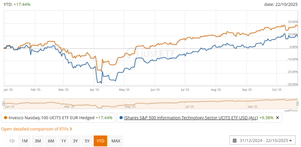 2. Invesco Nasdaq-100 ETF EUR Hedged și iShares S&P 500 Information Technology Sector ETF USD – dacă vrei expunere concentrată pe tema AI și tehnologie – motorul principal al creșterii actuale.