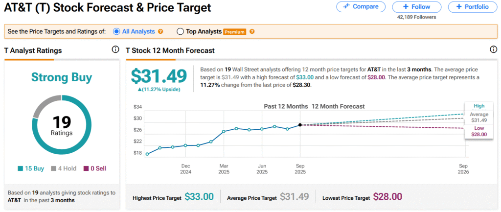 Verdictul analiștilor: Prețul actual de $28.3 vs o țintă medie de $31.49 (cu maximum la $33) sugerează că piața încă nu și-a dat seama complet cât valorează noul AT&T. Raymond James a ridicat ținta la $33 cu rating „Strong Buy”, iar Bernstein menține „Outperform” la $32. Majoritatea analiștilor consideră acțiunile subevaluate raportat la FCF-ul generat și potențialul de creștere în Fibră/5G.