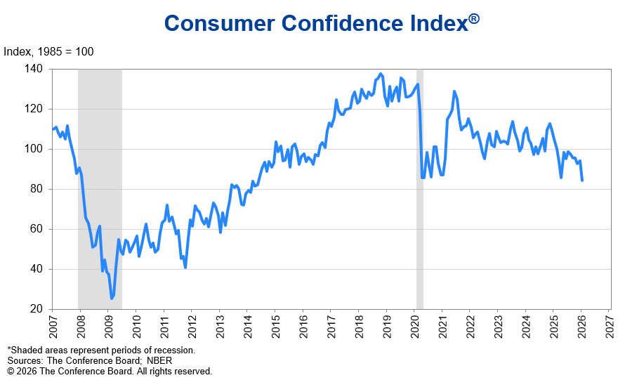 Dolarul, de exemplu, a căzut ca lovit de trăsnet, indicele USD s-a prăbușit cu 1,2%, cea mai abruptă scădere din ultimele patru luni, de prin aprilie 2025. Și dacă te uiți la consumatorii americani, ei bine, nu mai sunt atât de încrezători, Conference Board tocmai a raportat cel mai scăzut nivel de încredere din 2014. Să recapitulăm: burse la maxime, dolarul în cădere liberă, consumatorii speriați. Ceva nu se leagă, nu?