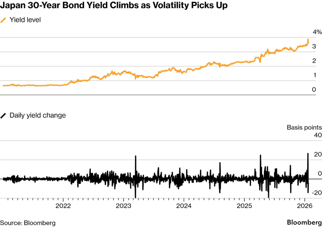 Creșterea bruscă a randamentelor obligațiunilor de stat japoneze i-a șocat pe traderi. Randamentul obligațiunilor pe 40 de ani a atins un nivel record de 4%, un prag care, pentru Japonia, e echivalentul unui cutremur de 8 grade Richter. Fluctuațiile randamentelor titlurilor de 30 de ani au depășit un sfert de punct procentual într-o singură sesiune. Să pun asta în perspectivă: înainte, o astfel de mișcare dura luni întregi. Acum? O zi.