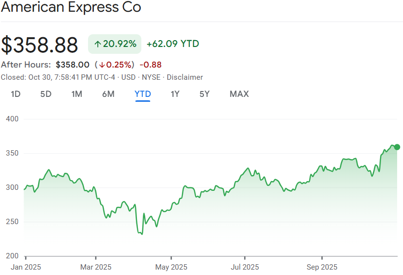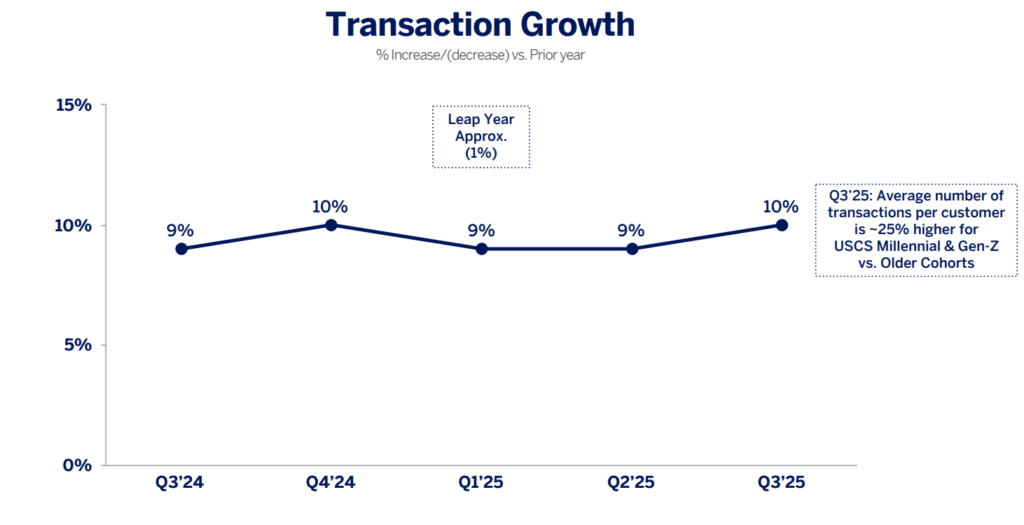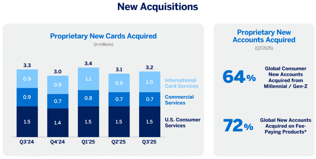 Veniturile totale în T3 au sărit cu 11% la $18,4 miliarde (un record absolut), împinse de creșterea cheltuielilor card-membru și comisioanelor nete. Câștigul pe acțiune (EPS) s-a catapultat cu 19% la $4,14, depășind lejer așteptările analiștilor care. Cheltuielile card-membru au accelerat cu 9% (8% ajustat după efectul valutar), un semn că baza de clienți nu doar supraviețuiește, ci cheltuie cu poftă.