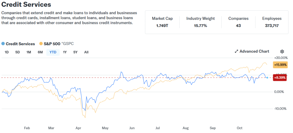 În timp ce S&P 500 s-a îmbătat cu un câștig de 16% pe ultimul an, sectorul serviciilor de credit s-a târât după el cu doar 8% – rămânând în umbră, subevaluat, așteptând momentul său de glorie.