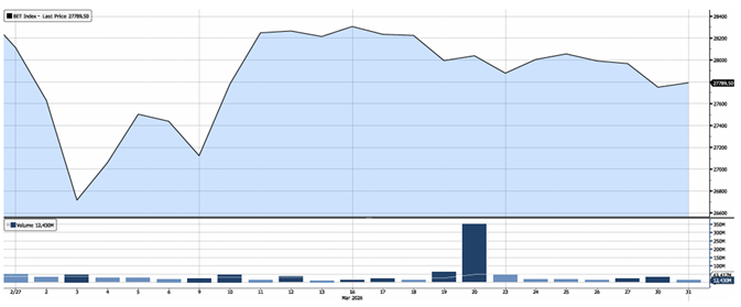 În luna martie, indicele principal al pieței de acțiuni românești (BET-TR) a înregistrat o evoluție negativă, marcând o scădere de 1,15%, în contextul incertitudinilor privind conflictul din Orientul Mijlociu dintre SUA și Iran.
