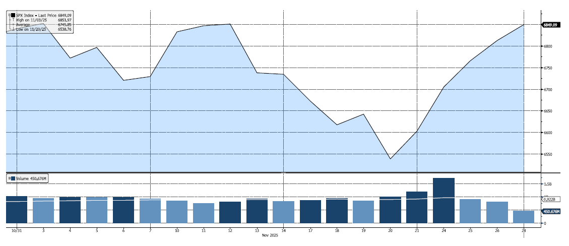 Luna noiembrie a fost caracterizată de optimism privind reducerea dobânzii de politică monetară din partea FED, până la intervalul 3,50% – 4,75%, precum și de acordul privind redeschiderea guvernului. În ceea ce privește problemele macroeconomice interne, preocupările principale sunt legate de deteriorarea pieței muncii, precum și de scăderea ratei inflației spre nivelul obiectivului pe termen lung de 2%.