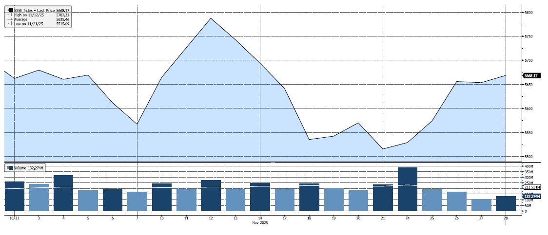 În luna noiembrie 2025, piețele de acțiuni europene au înregistrat valori pozitive, însă modeste comparativ cu luna anterioară. Printre principalele sectoare care au contribuit la avansul înregistrat se numără cel energetic și cel tehnologic, în timp ce sectorul financiar și cel al comunicațiilor au marcat printre cele mai slabe evoluții.
