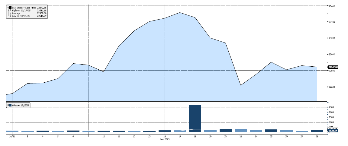 In luna noiembrie, indicele BET-TR a crescut cu 3,16%, pe baza performanței sectorului bancar, cele mai importante randamente fiind generate de companii cu ponderi reduse în indice, precum Premier Energy (+10,79%) și Transport Trade Services (+10,16%). La polul opus, cele mai mari scăderi au fost înregistrate de Aquila Part Prod (-6,41%) și Transelectrica S.A. (-5,17%).