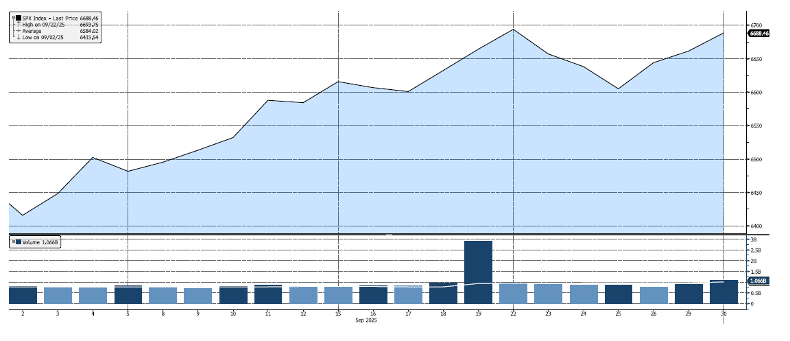 Piețele bursiere din SUA au încheiat luna septembrie cu o creștere de 3,53%. Avansul indicelui S&P 500 s-a datorat în principal sectorului tehnologic, care a marcat un plus de 7,21%, urmat de sectorul serviciilor de comunciare, care a înregistrat o creștere de 5,53%.