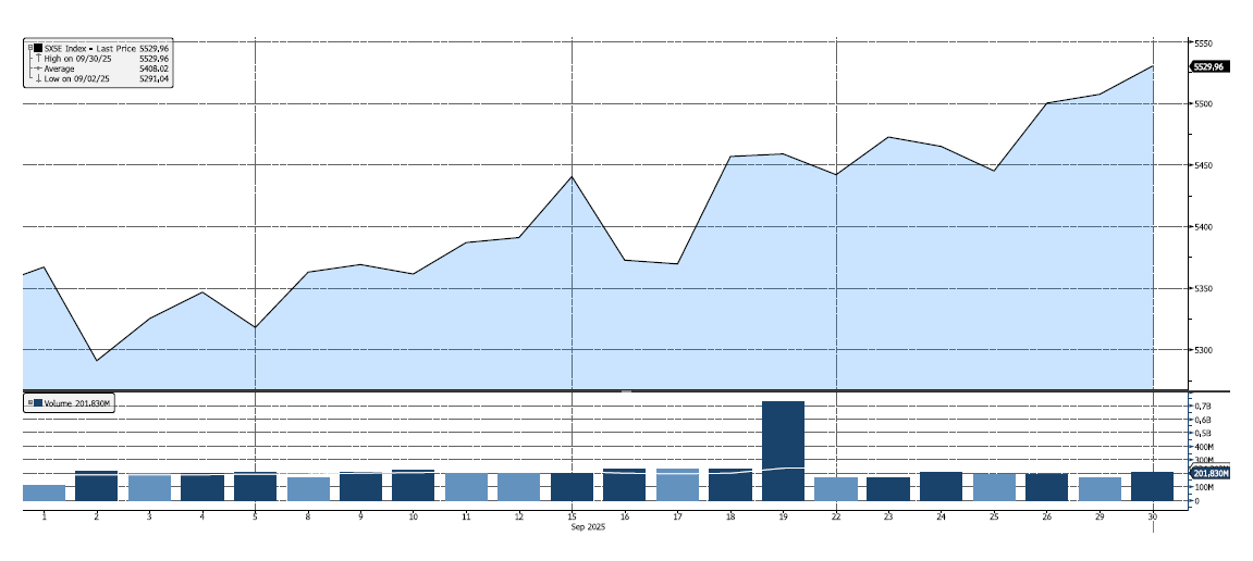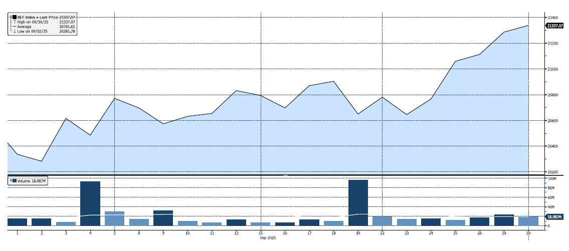 În luna septembrie, indicele BET-TR a crescut cu 3,83% pe baza performanței sectorului energetic, dar și a unor companii precum ONE United Properties (+13,79%) și Digi Communications (+9,76%). La polul opus, cele mai mari scăderi au fost înregistrate de MedLife S.A. (-2,61%) și S.N. Nuclearelectrica (-1,52%).
