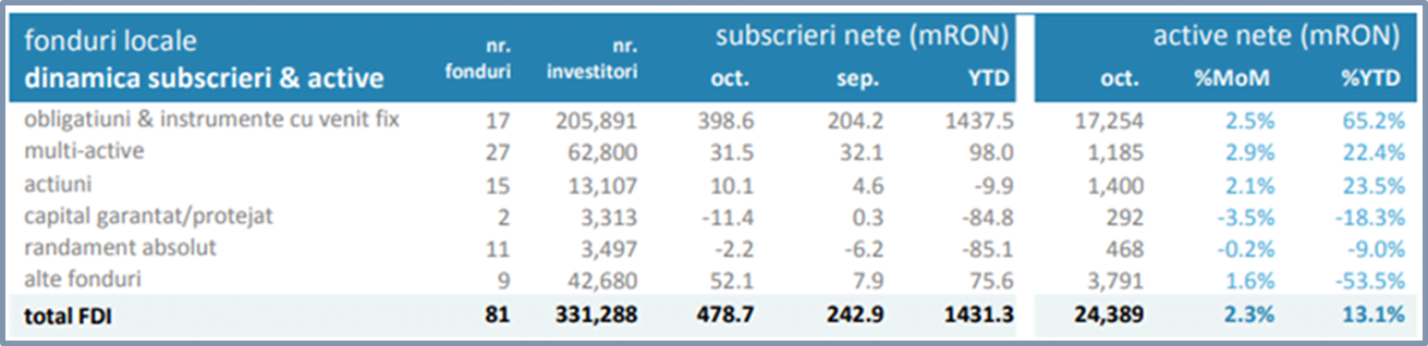 Astfel, desi la finele lunii octombrie 2019 numărul investitorilor din fondurile locale deschise ajunsese doar la 331,288, cu active în creștere de la începutul anului (YTD 13,1%), tabloul investitorilor își păstrează structura: 83,8% investesc în fonduri locale de obligațiuni și venit fix și doar 6,7% în fonduri locale de acțiuni.